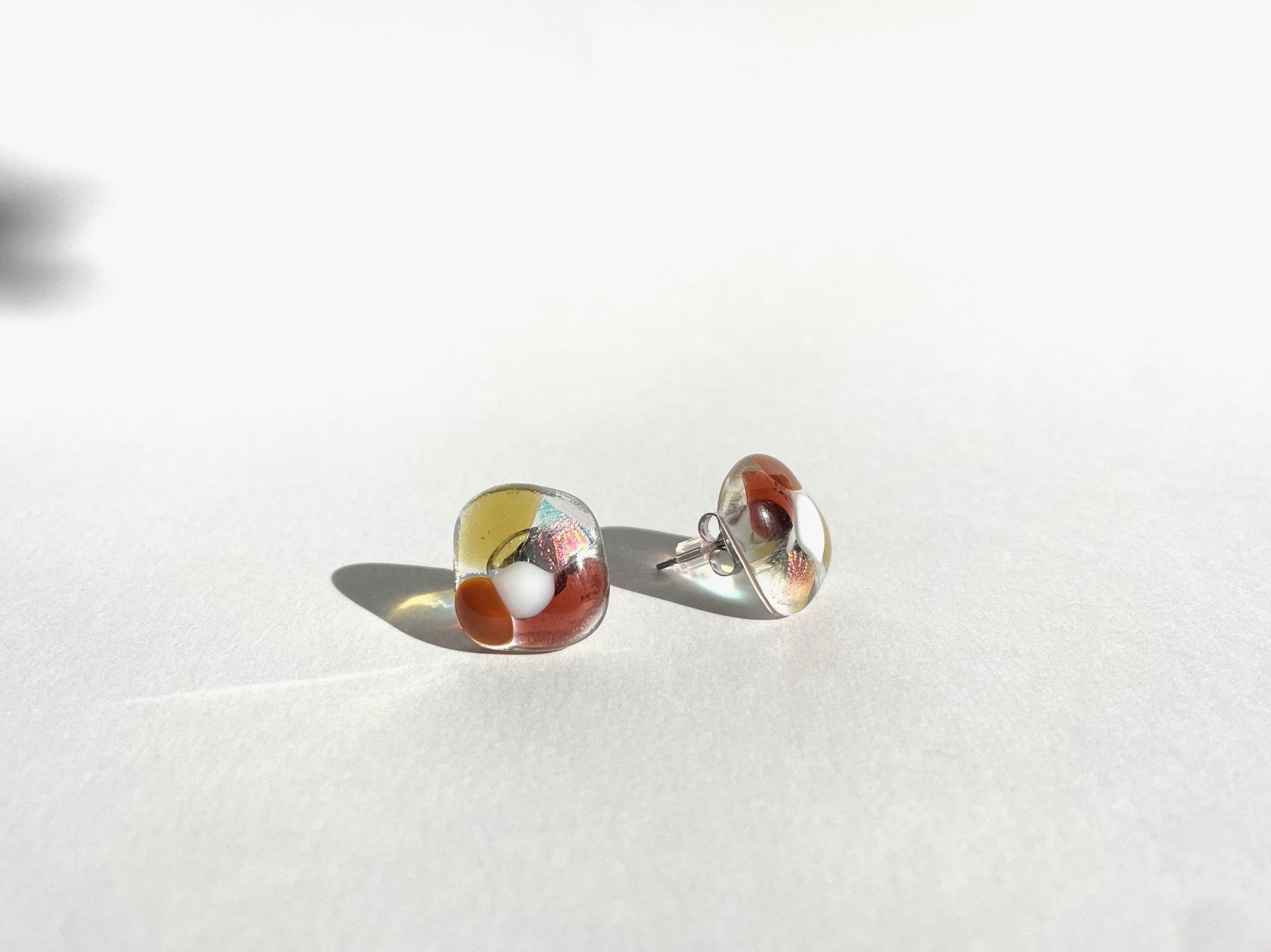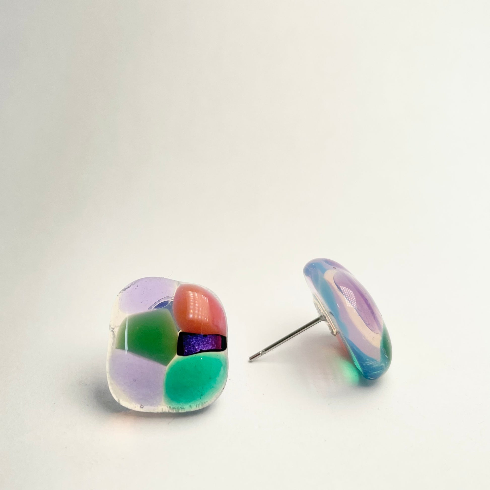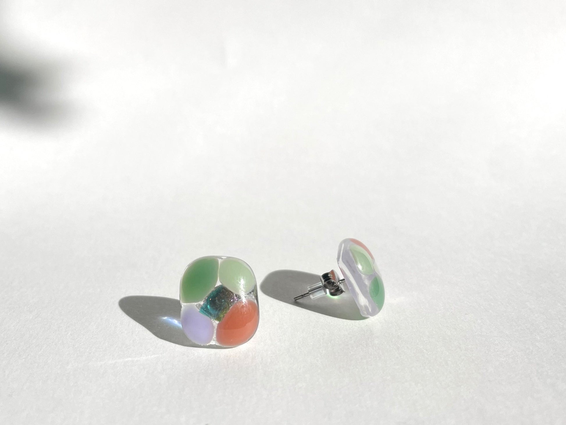 Kendall uses small scraps of colorful flat sheets of glass, and breaks them into small bits that can be collaged onto a base of clear glass. These forms are placed into a kiln and brought up to 1480 degrees Fahrenheit, a temperature where the glass fully melts together and becomes one solid object.