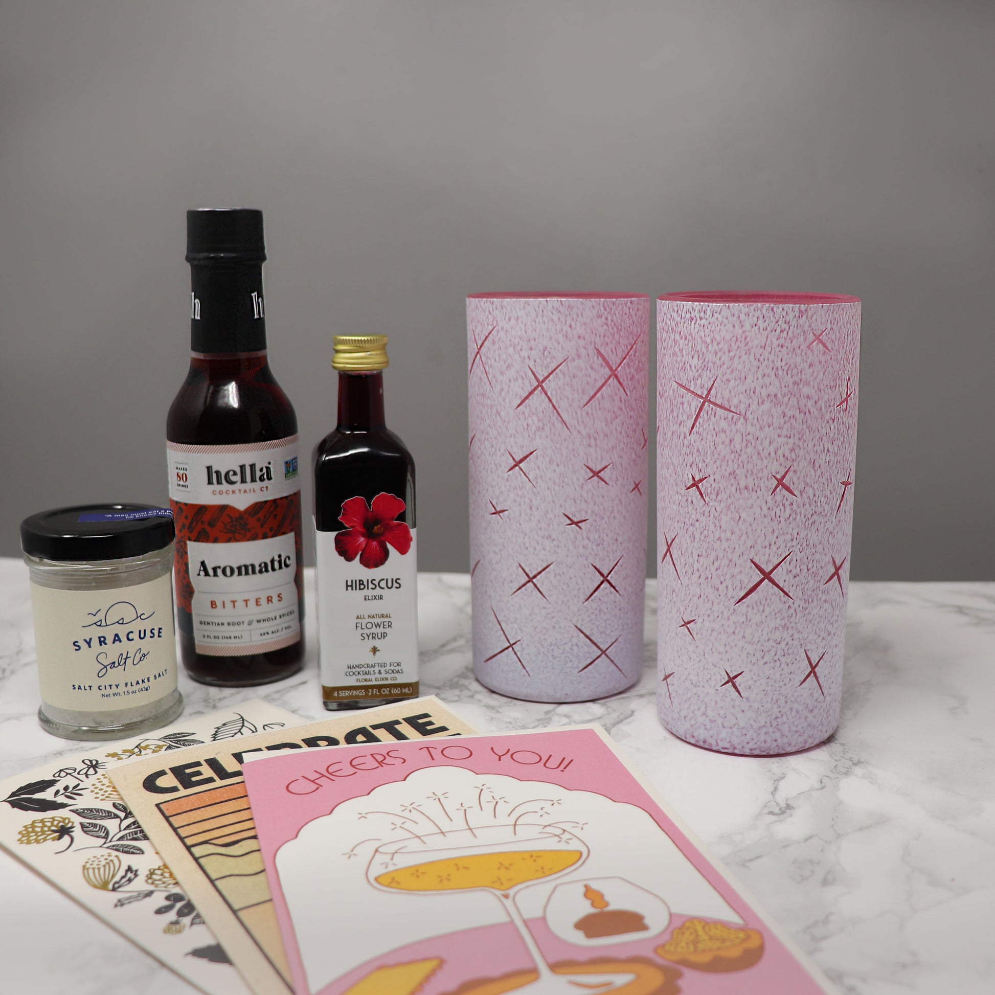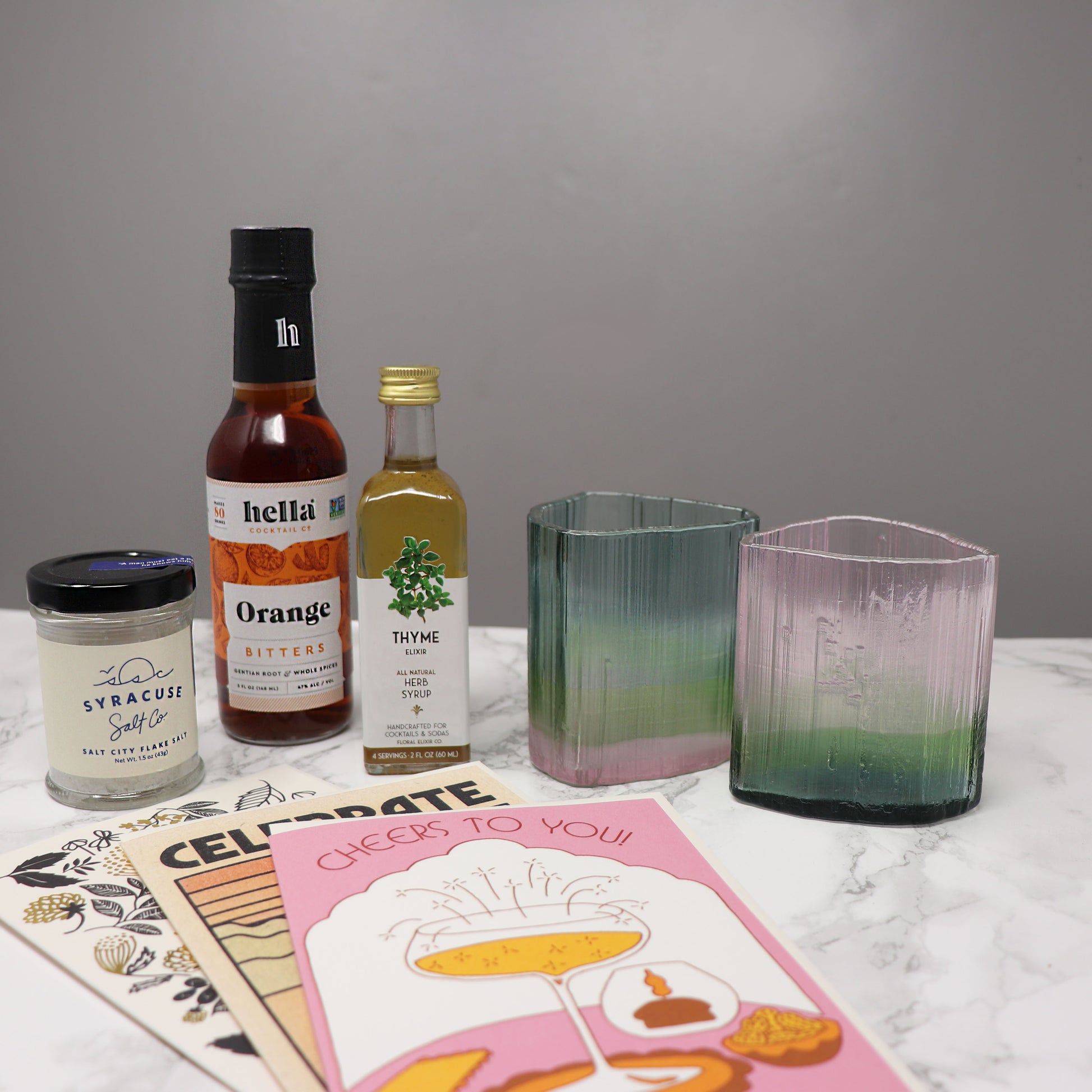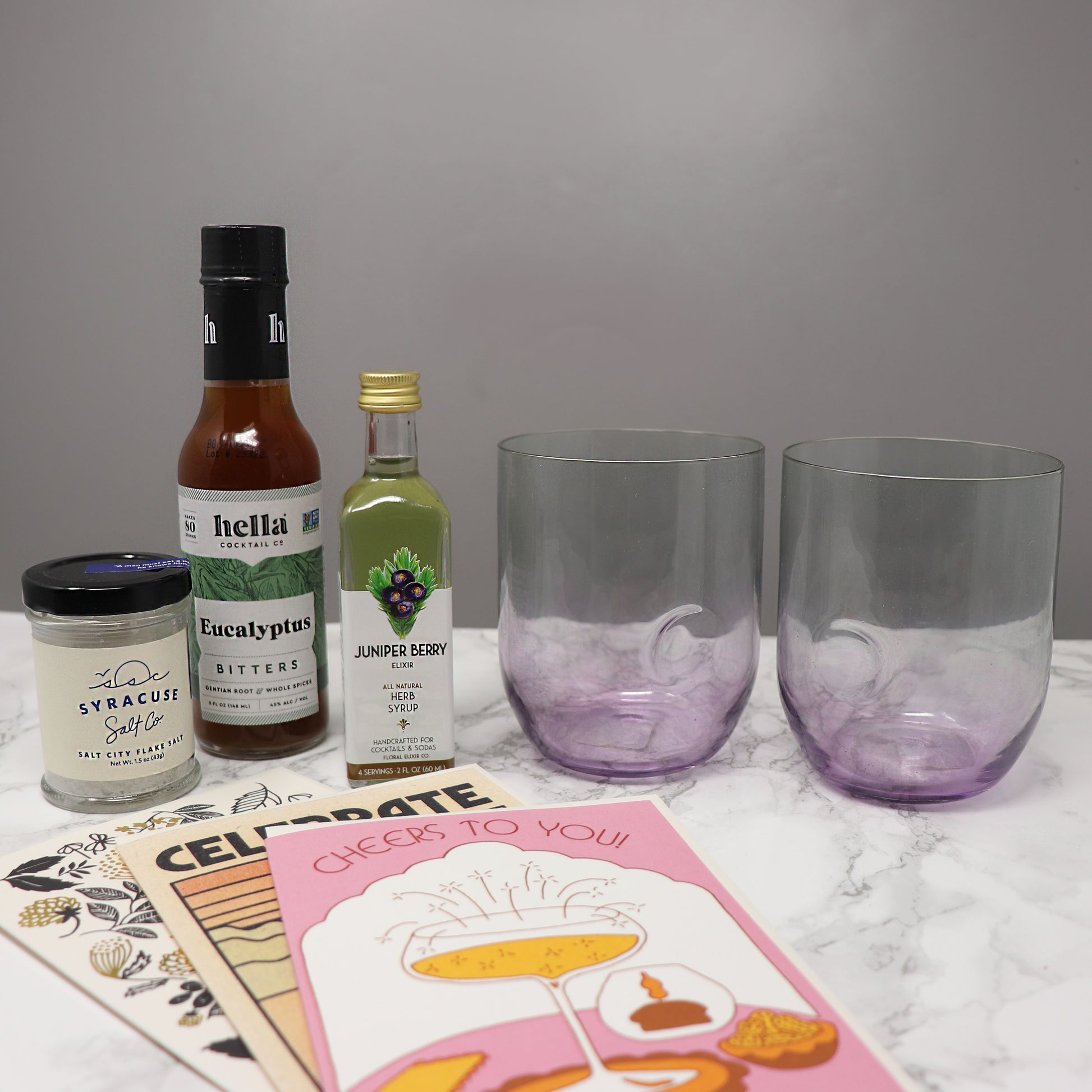 Add this upgrade to any purchase of glassware and for an additional $40, let us put together a gift bag of a handprinted card, finishing salts, cocktail syrup and bitters. Just let us know what the occasion is and we'll take care of the rest!
