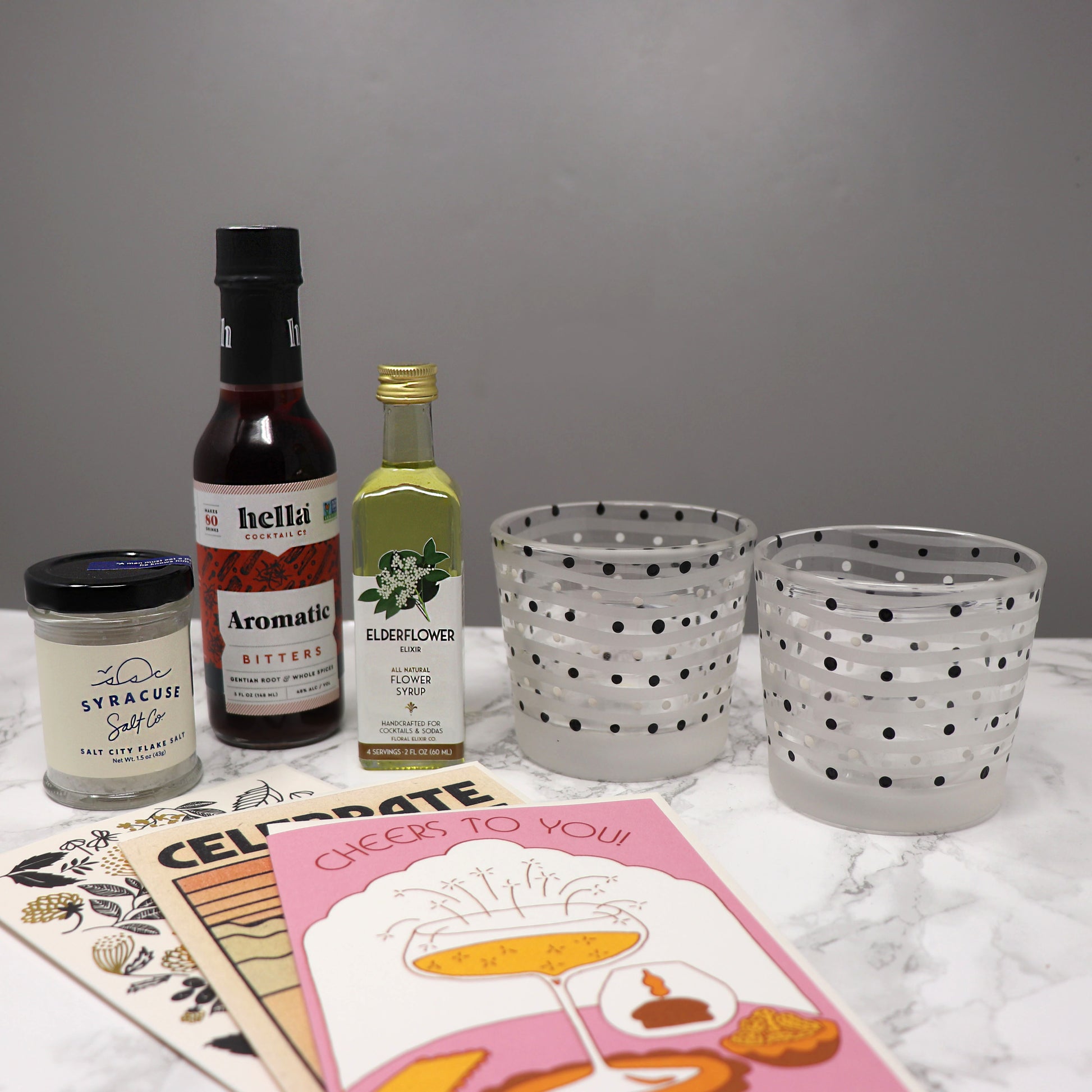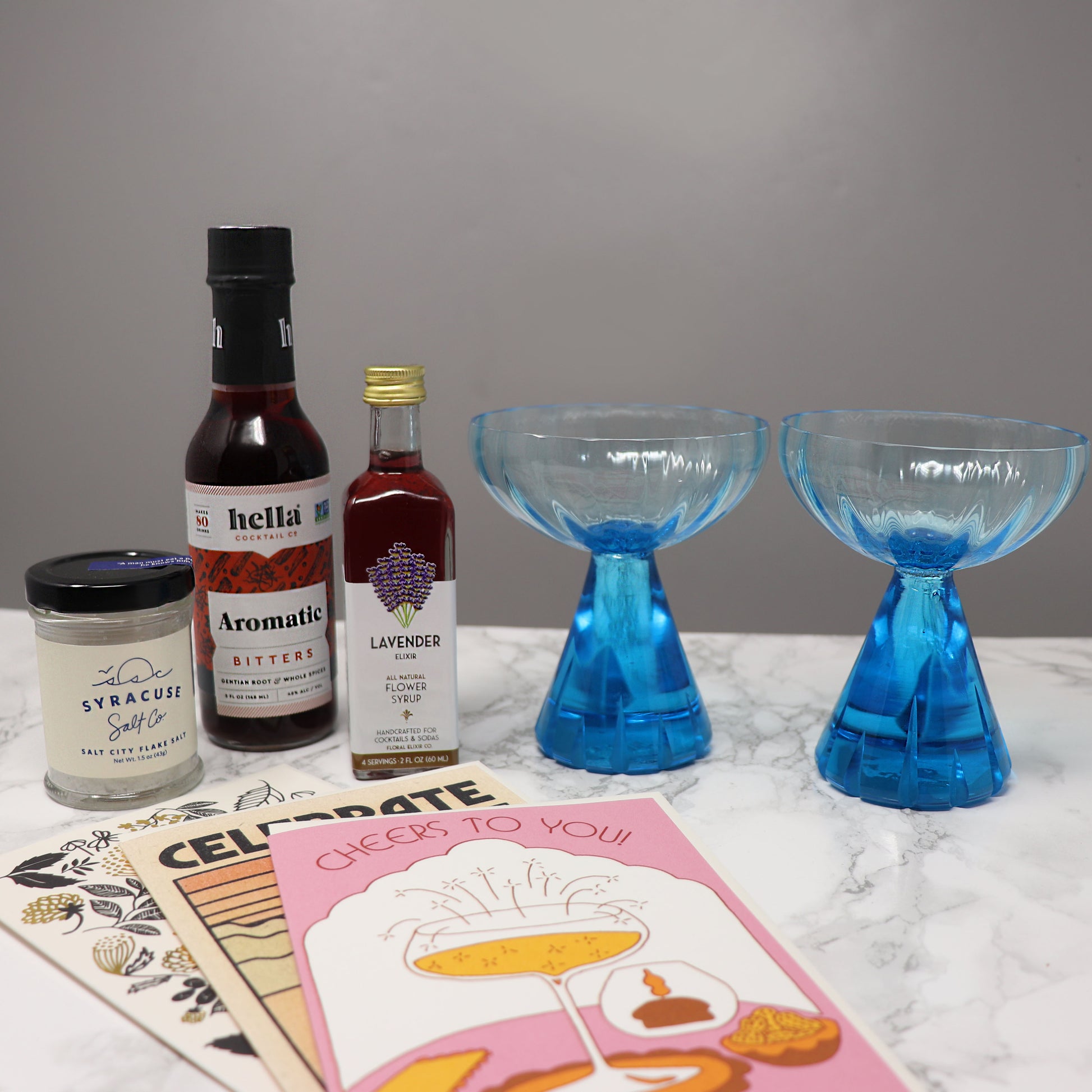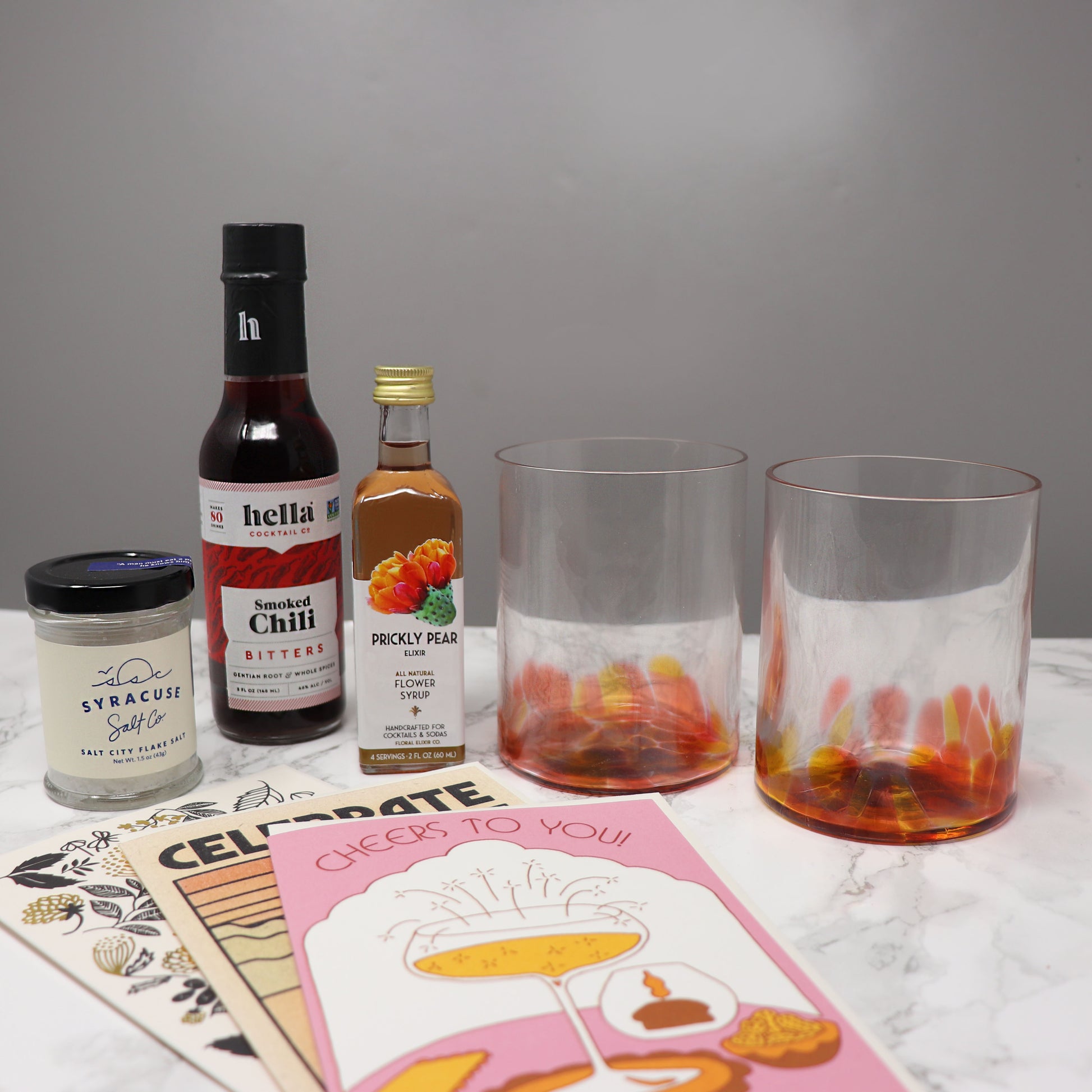 Add this upgrade to any purchase of glassware and for an additional $40, let us put together a gift bag of a handprinted card, finishing salts, cocktail syrup and bitters. Just let us know what the occasion is and we'll take care of the rest!