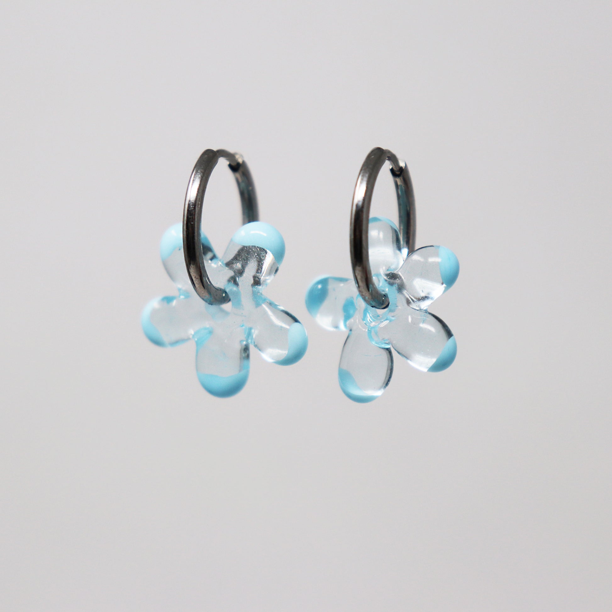 Soft glass flower earrings on stainless steel lever-back hoops.
