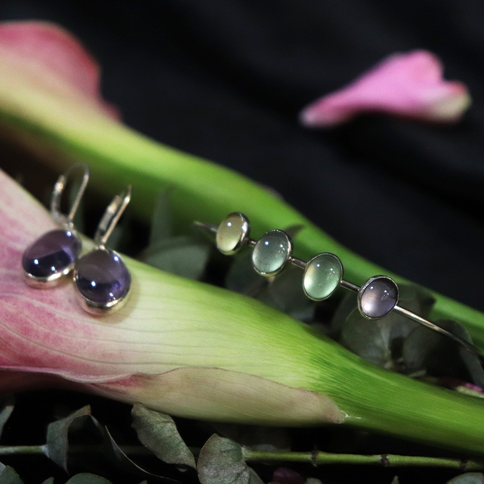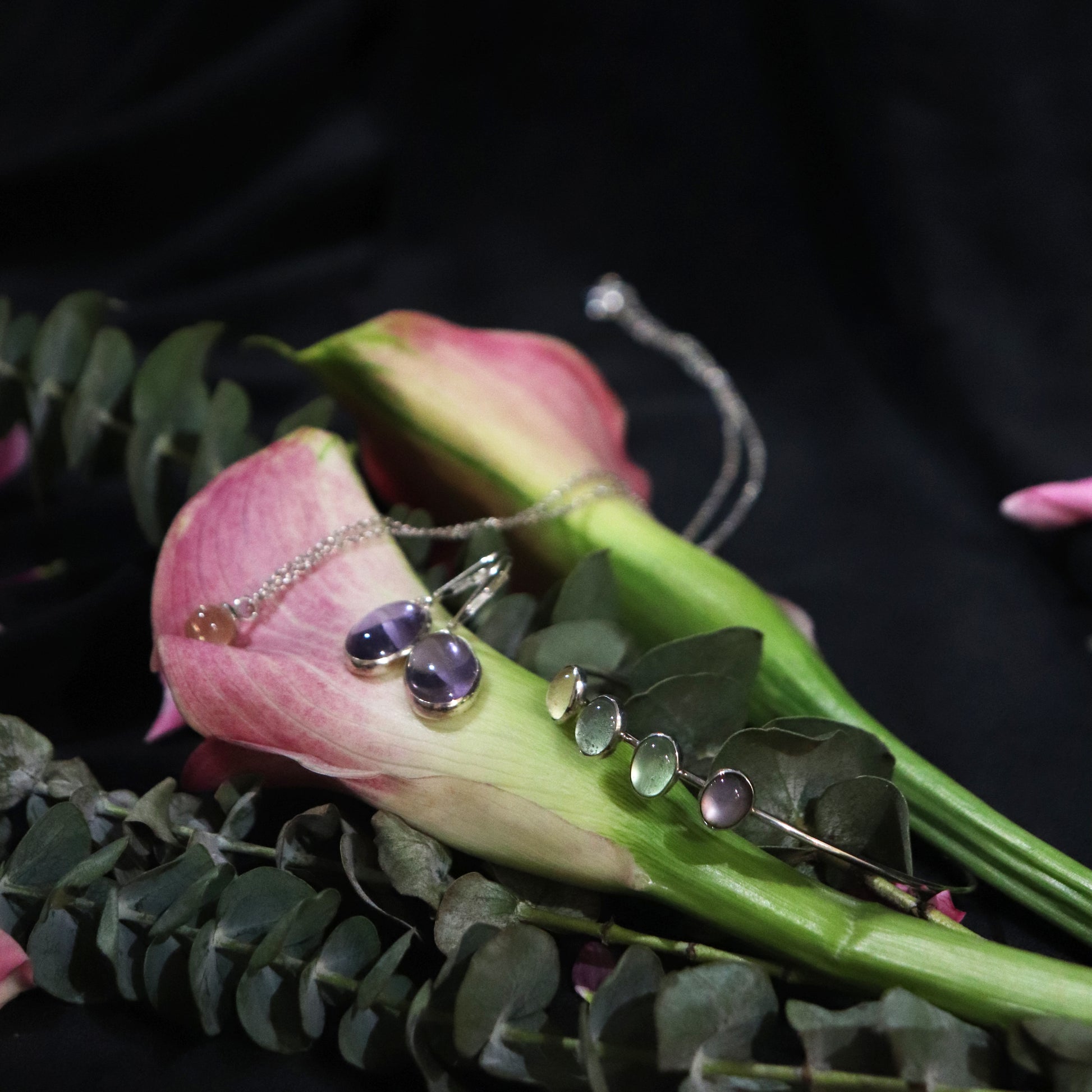 Photographed with the AUR Medium Shift Pendant Earrings and Orb Pendant Necklace in Pink-Yellow.