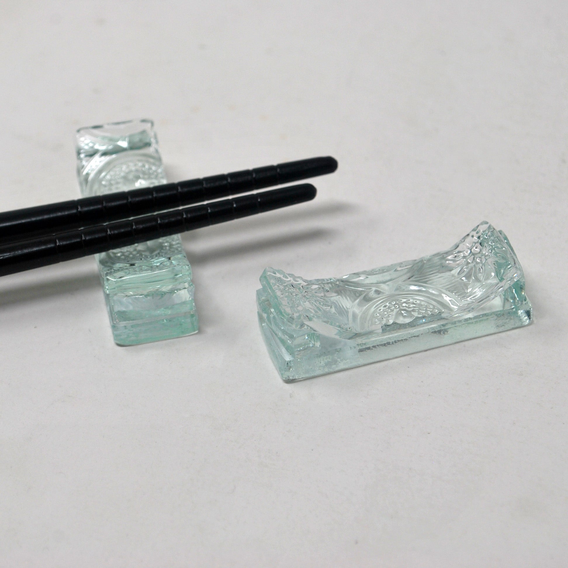 Chiung-Yi Huang reuses patterned glass from old houses in Taiwan to create modern tableware. These kiln-formed chopstick holders come as a set of two and each measures approximately .5 x 1.5 inches.