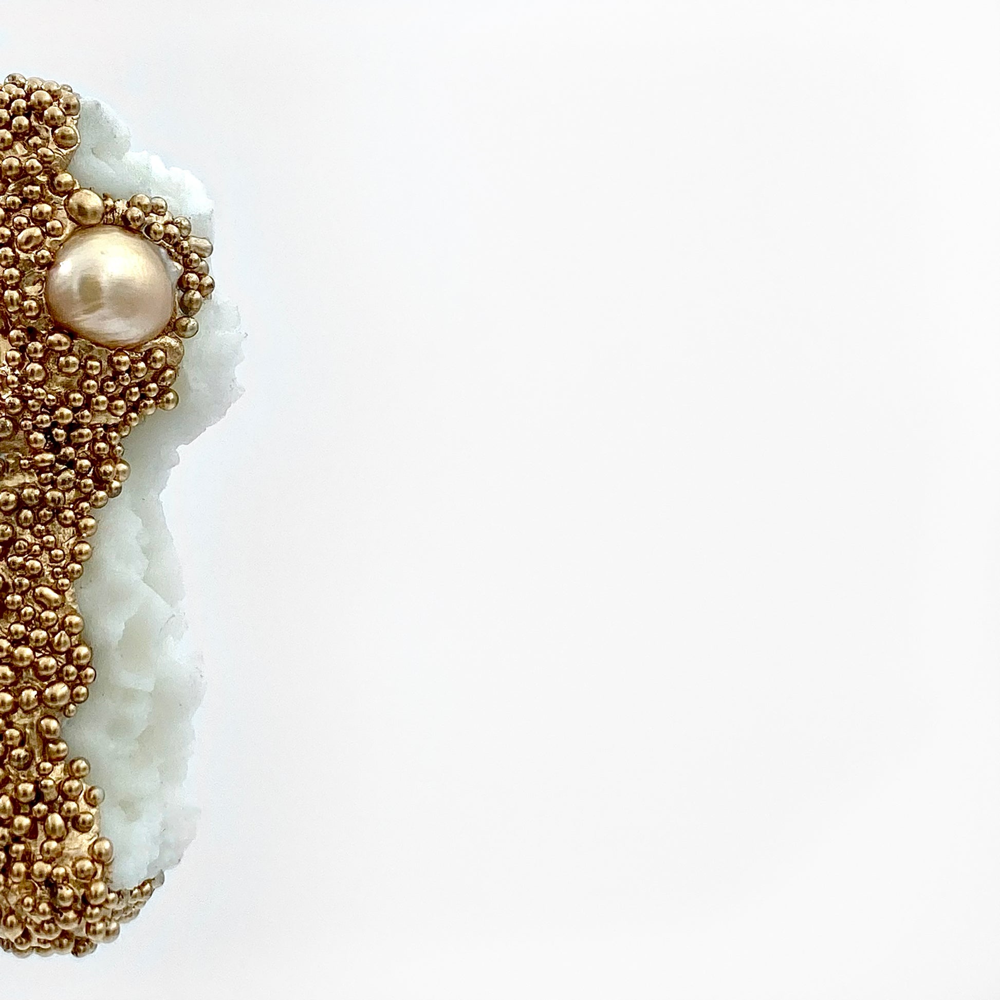 Cast white glass, pearl, glass beads, gold leaf enamel. Measures 2 x 1.5 x 1 inches, size 7.