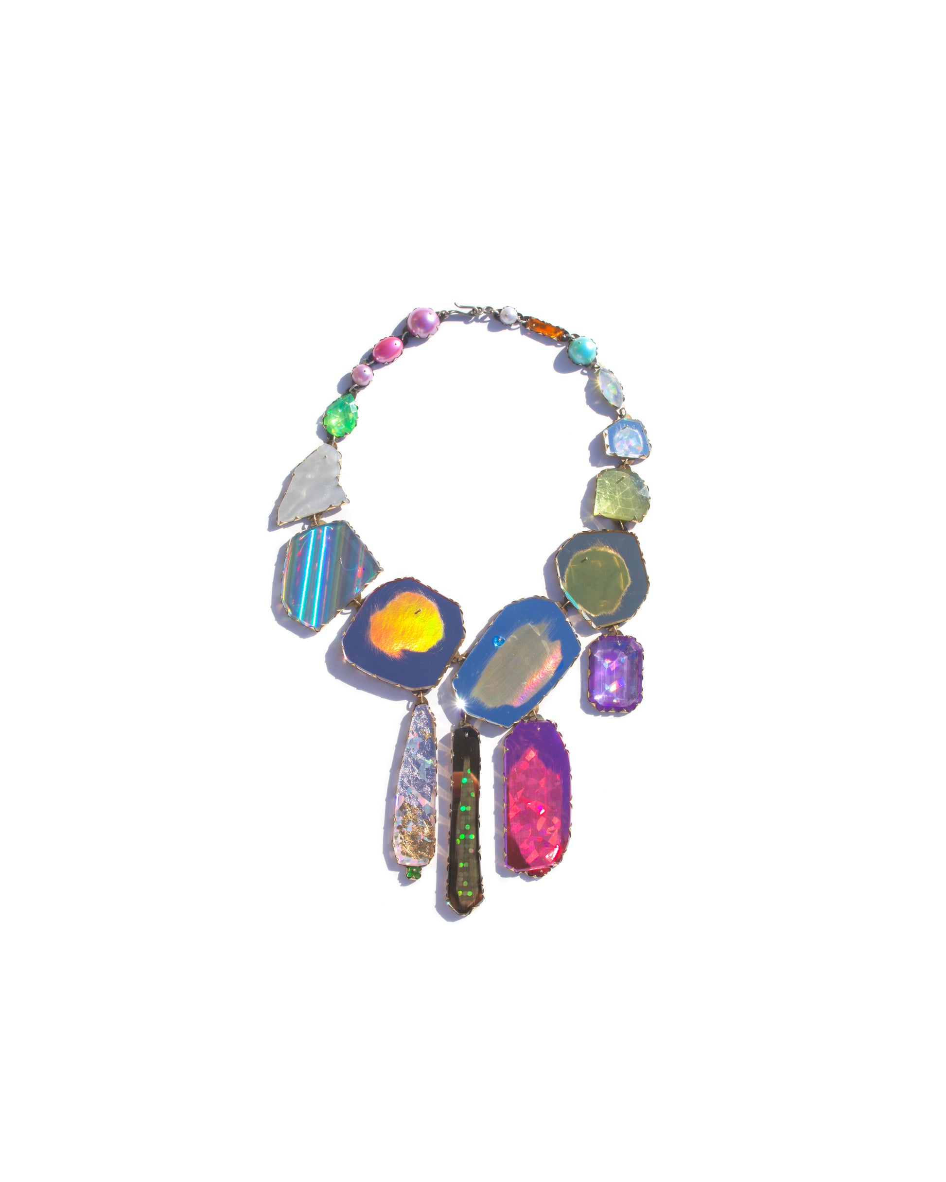 Hologem Necklace made with brass, nickel, acrylic sheet, acrylic gems, laminate, resin, and paper.