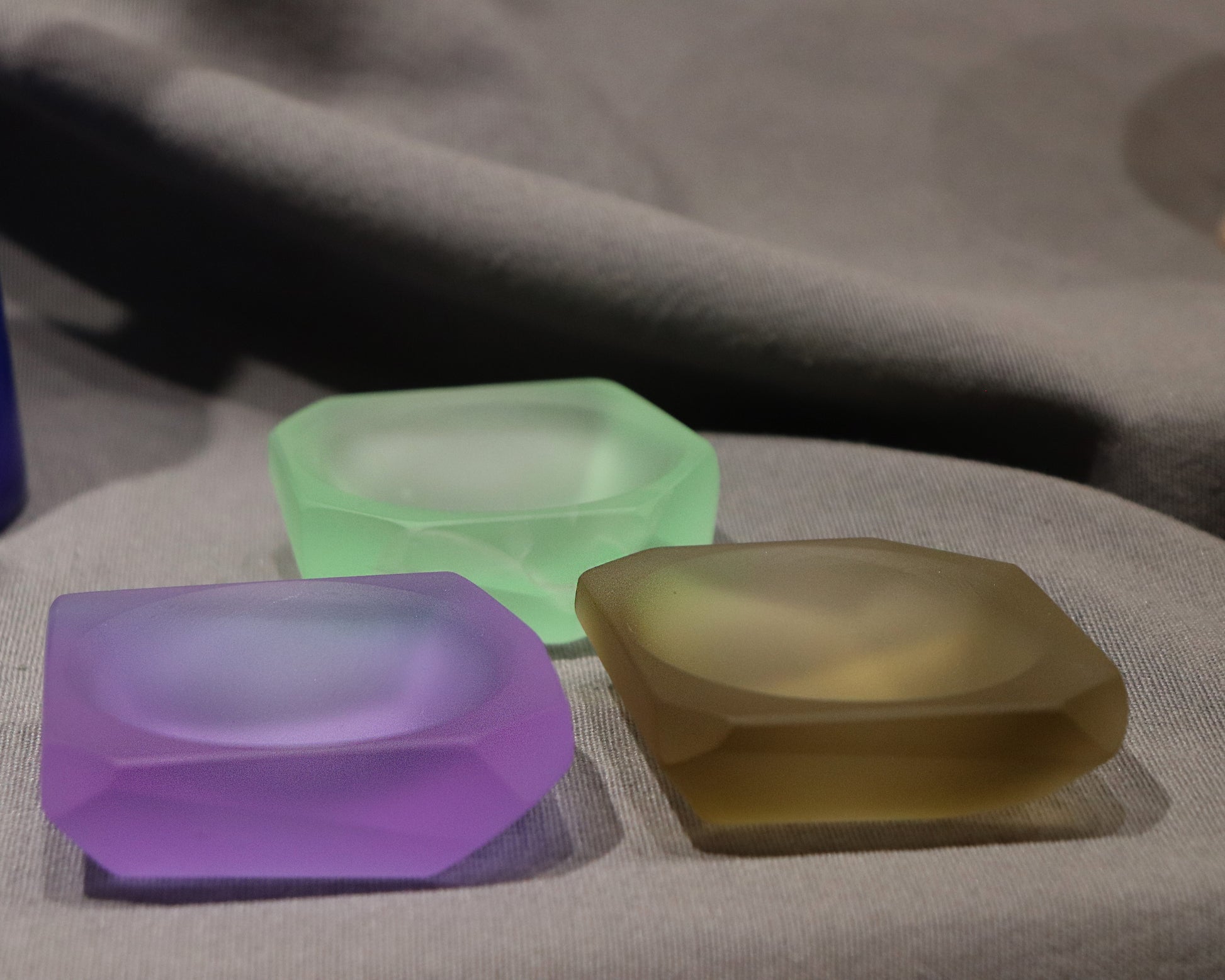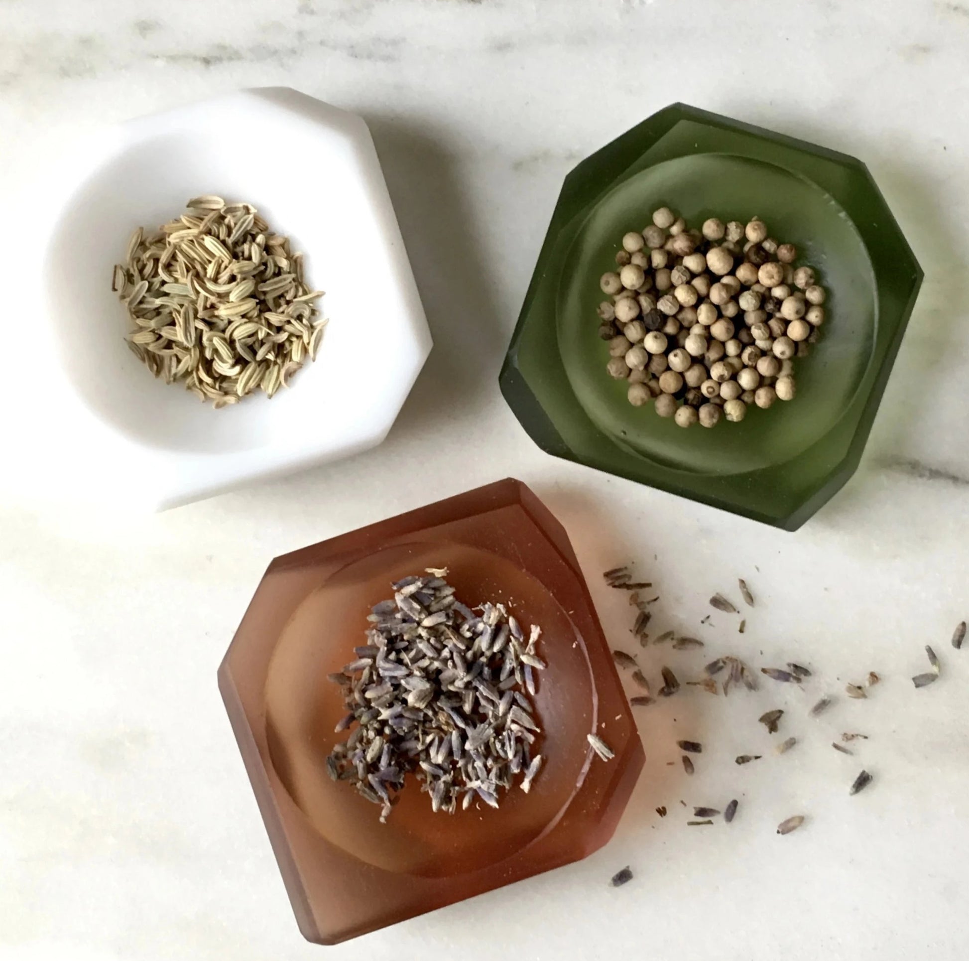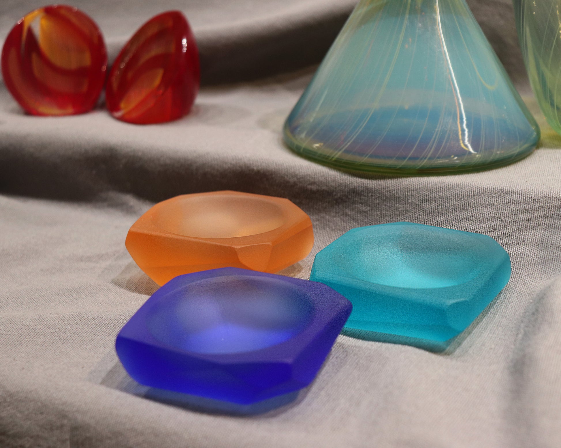 These lovely glass dishes are the perfect little ring dish, catch-all, or salt cellar. Pick out your favorite color in the menu.