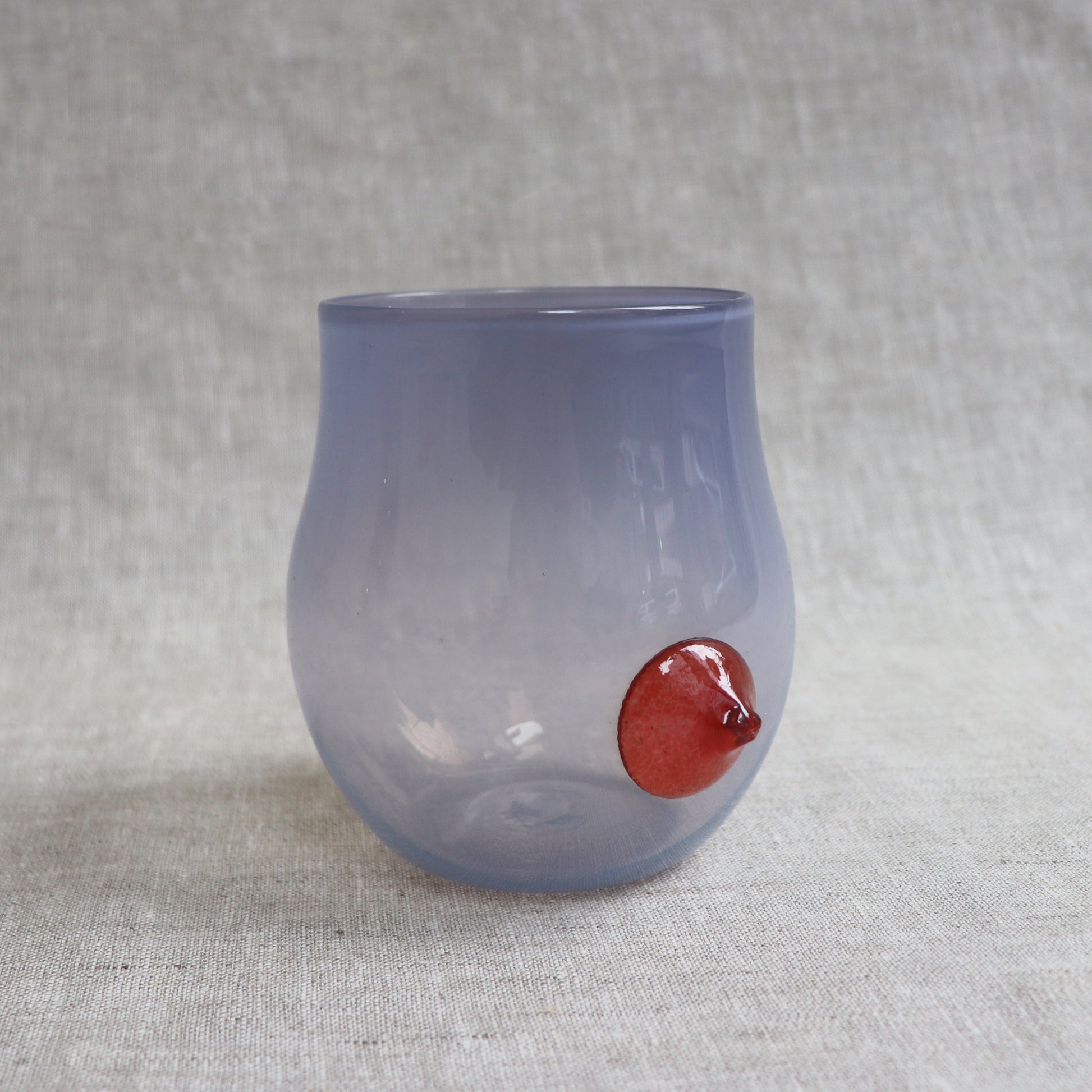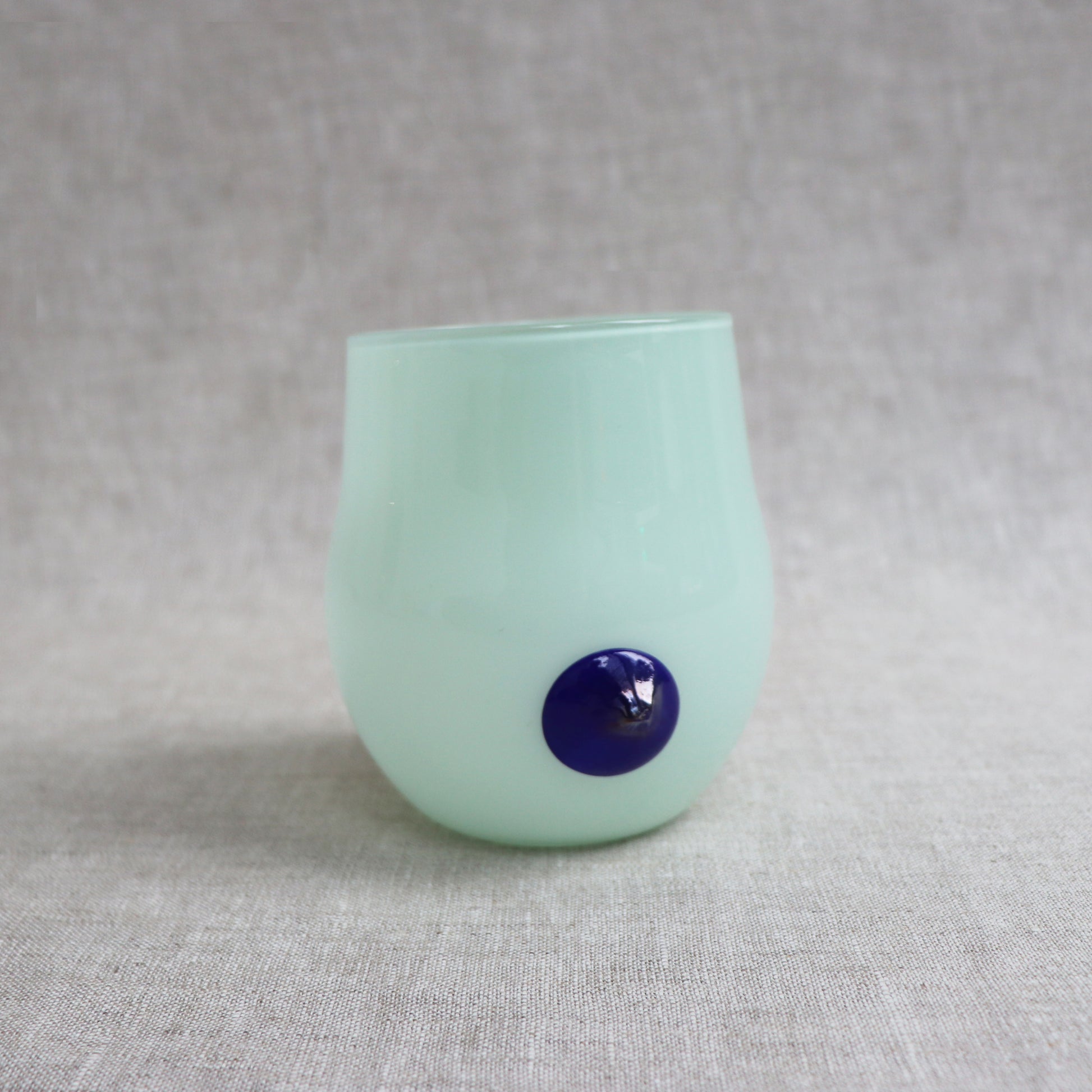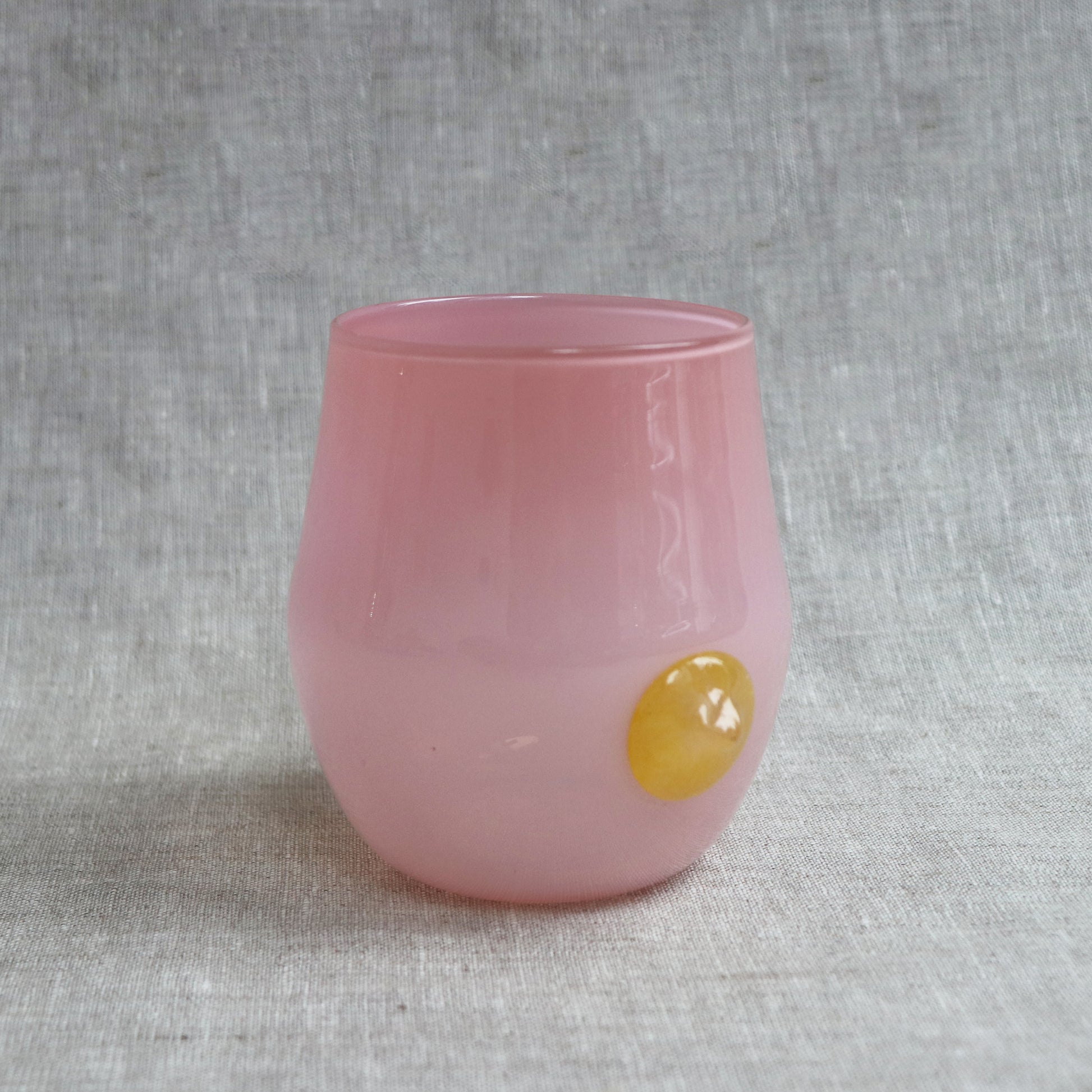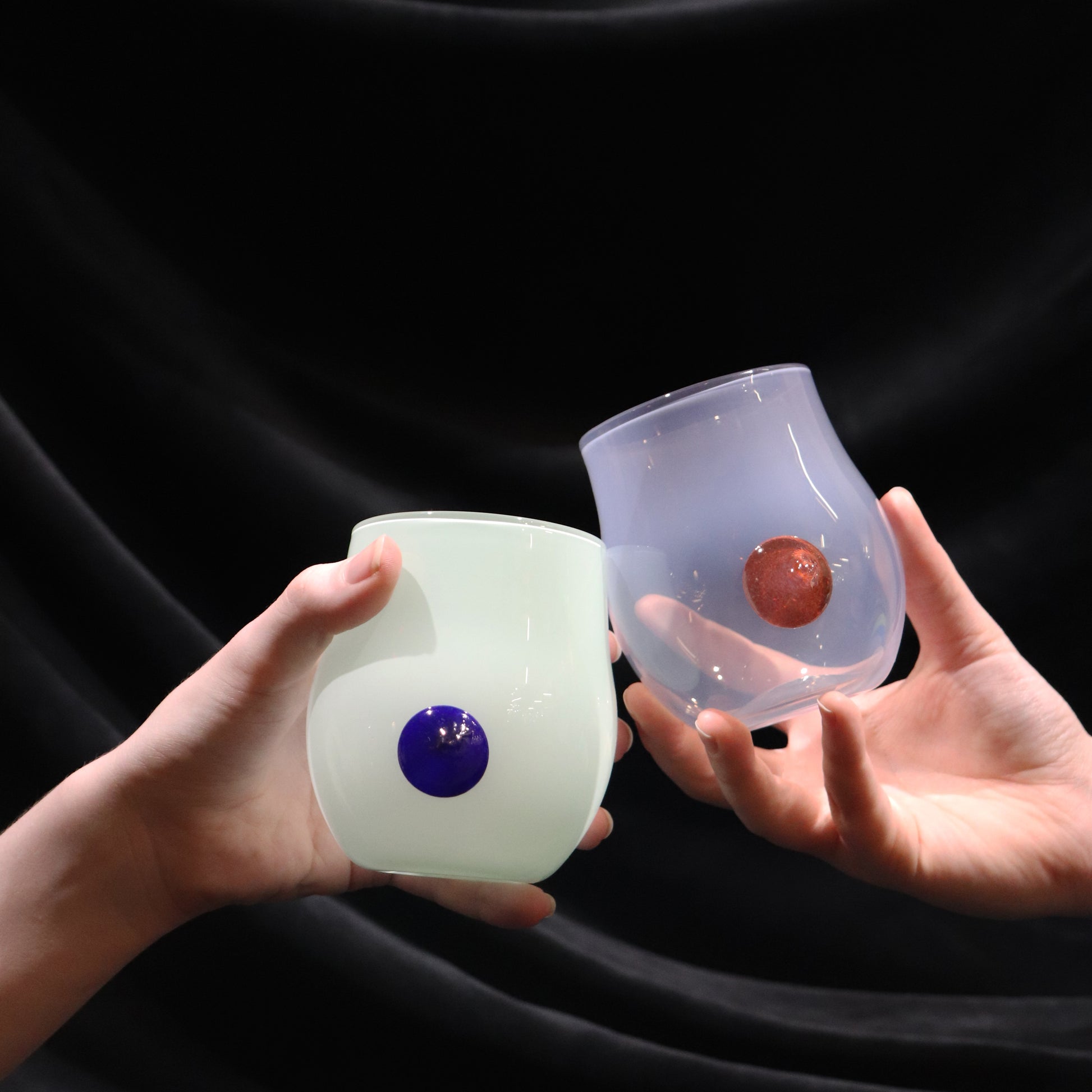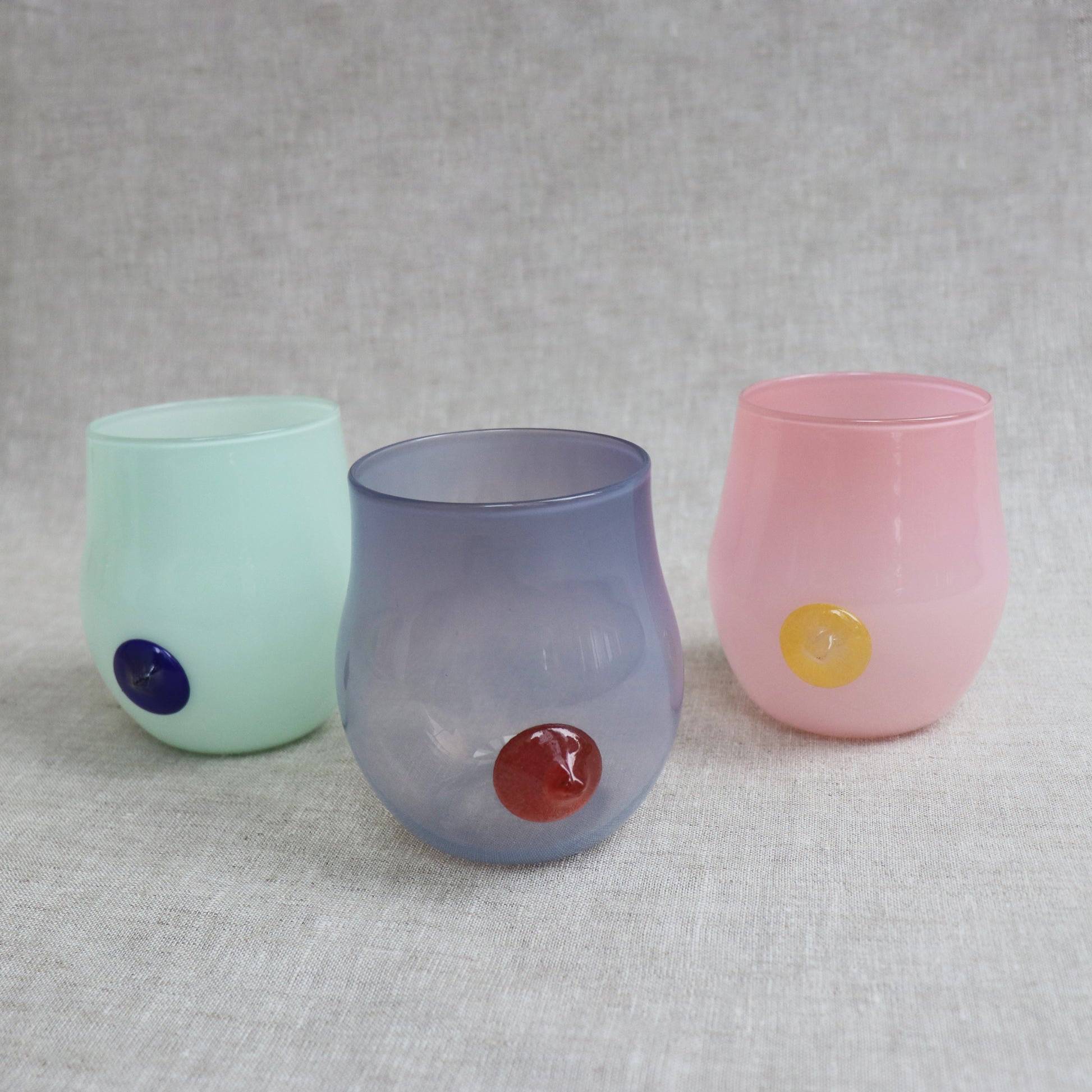 The stemless wineglasses start with an overlay of color for the cup's body. It then gets blown and shaped into the desired dimension. After punty, the cup is trimmed and opened to the right size. The prunt rolls in colored frit and is put on the body of the cup last.