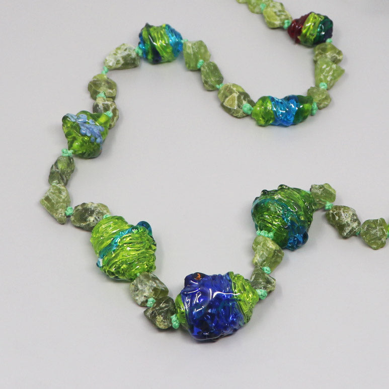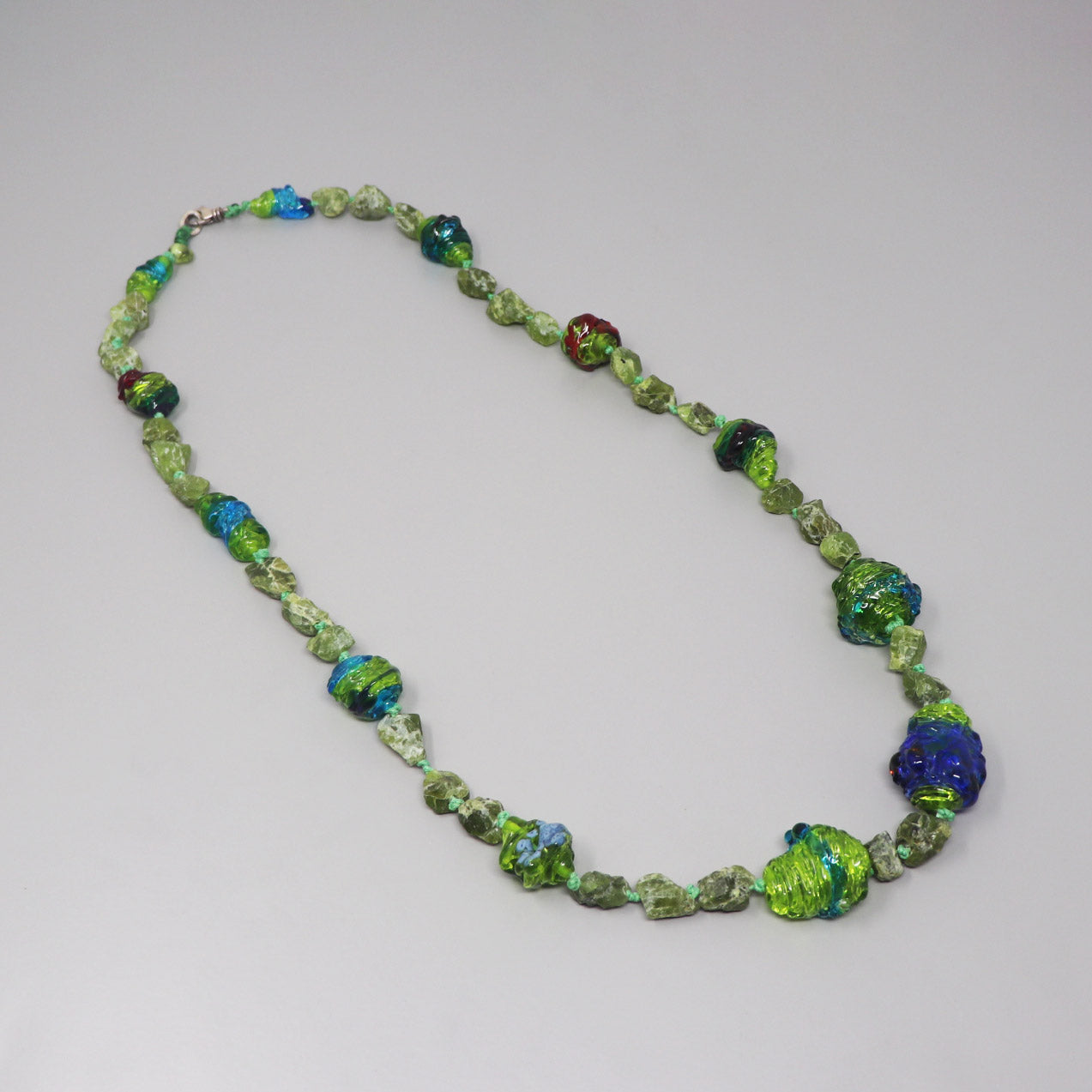 Flameworked glass beads, rubies, sterling silver, waxed cotton cord.