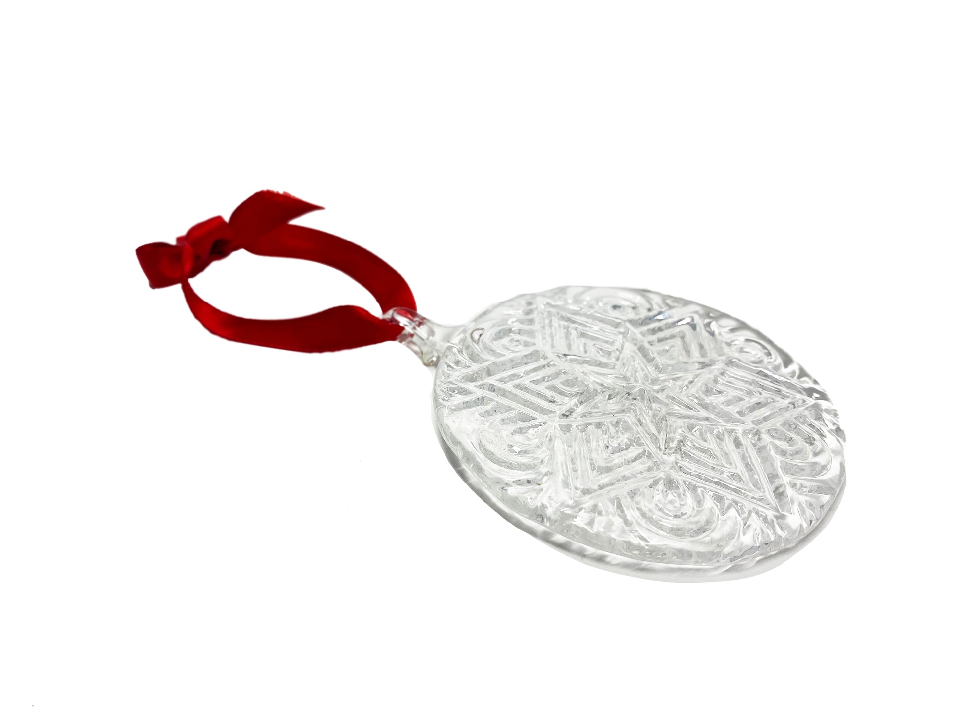 These stunning clear ornaments have been pressed using antique waffle irons to create the patterns imprinted in the glass.
